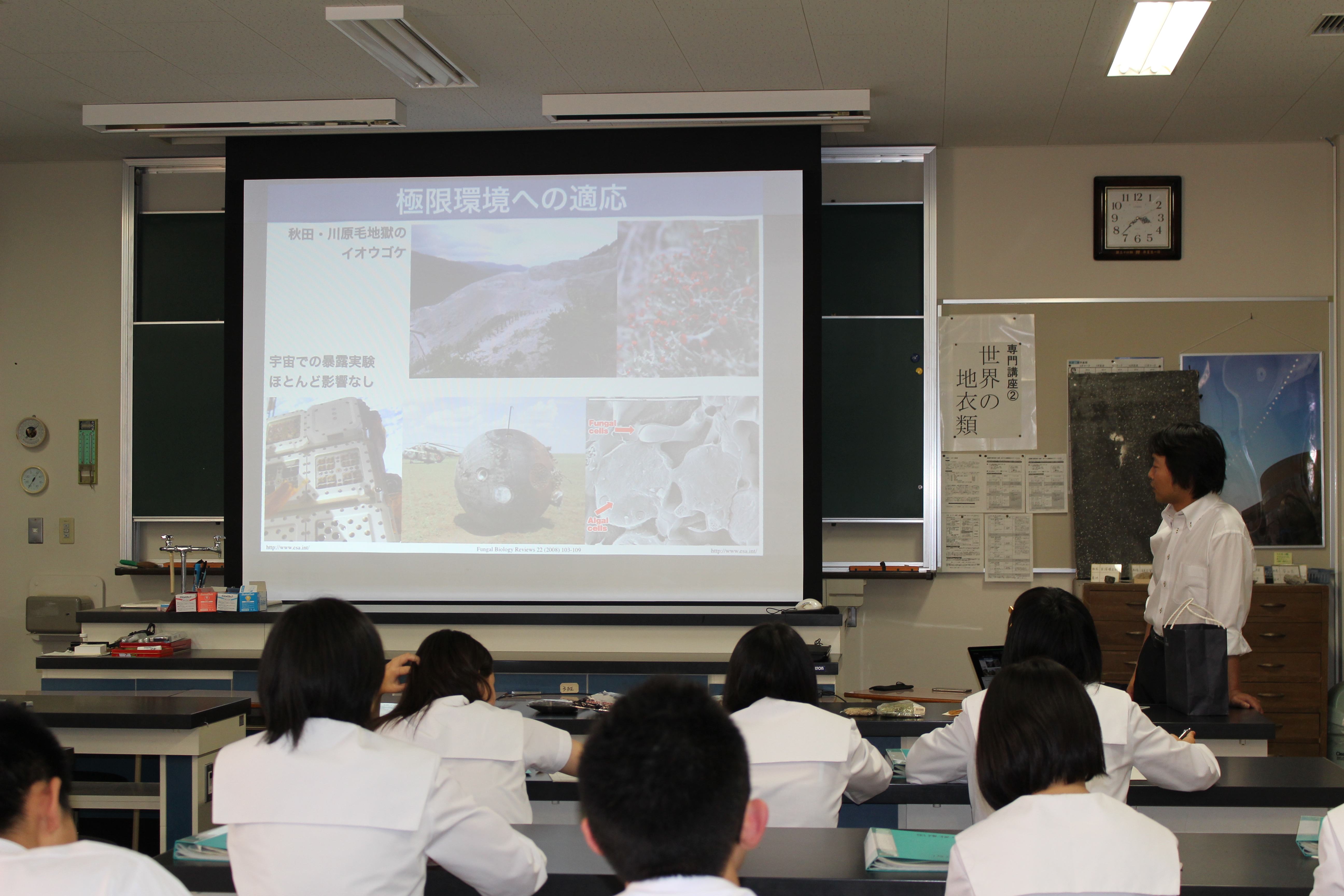 地衣類という生物をどのように農業生産に役立てることができるかというお話をしていただきました。 地衣類は独特の成分を持ち、環境の悪化や他の生物から身を守るなど環境ストレスに強い生物で、この能 力を遺伝子組み換え技術により用いて気候変動、異常気象に負けない作物をつくることができます。 また、地衣類は熱帯から極圏まで様々な環境で生育可能で、その能力を活かして、極限環境で生育が できる作物をつくり、砂漠の緑化などで緑地減少を防ぐことが考えられ、食糧問題解決のアプローチ として新たな視点を持つことができました。