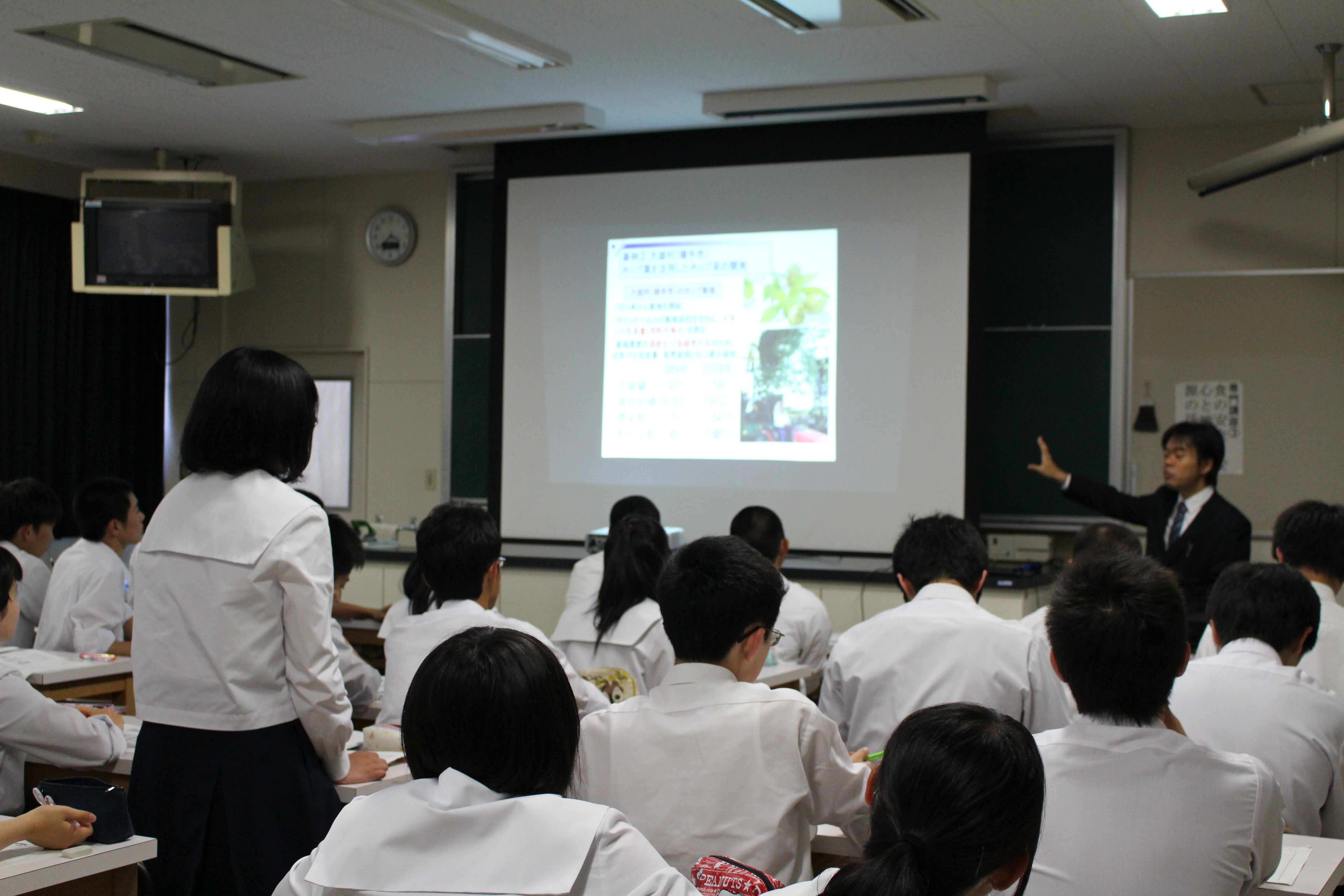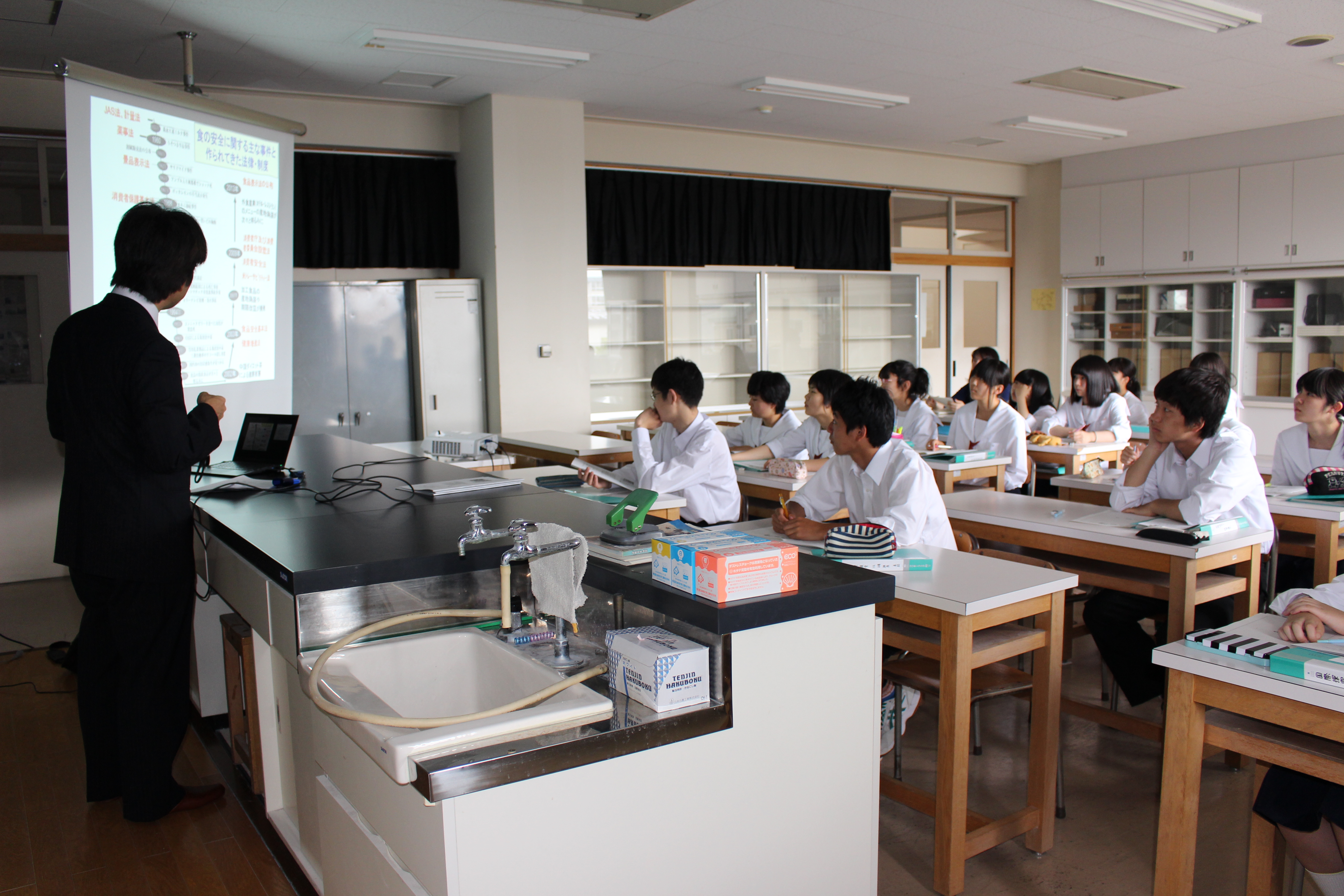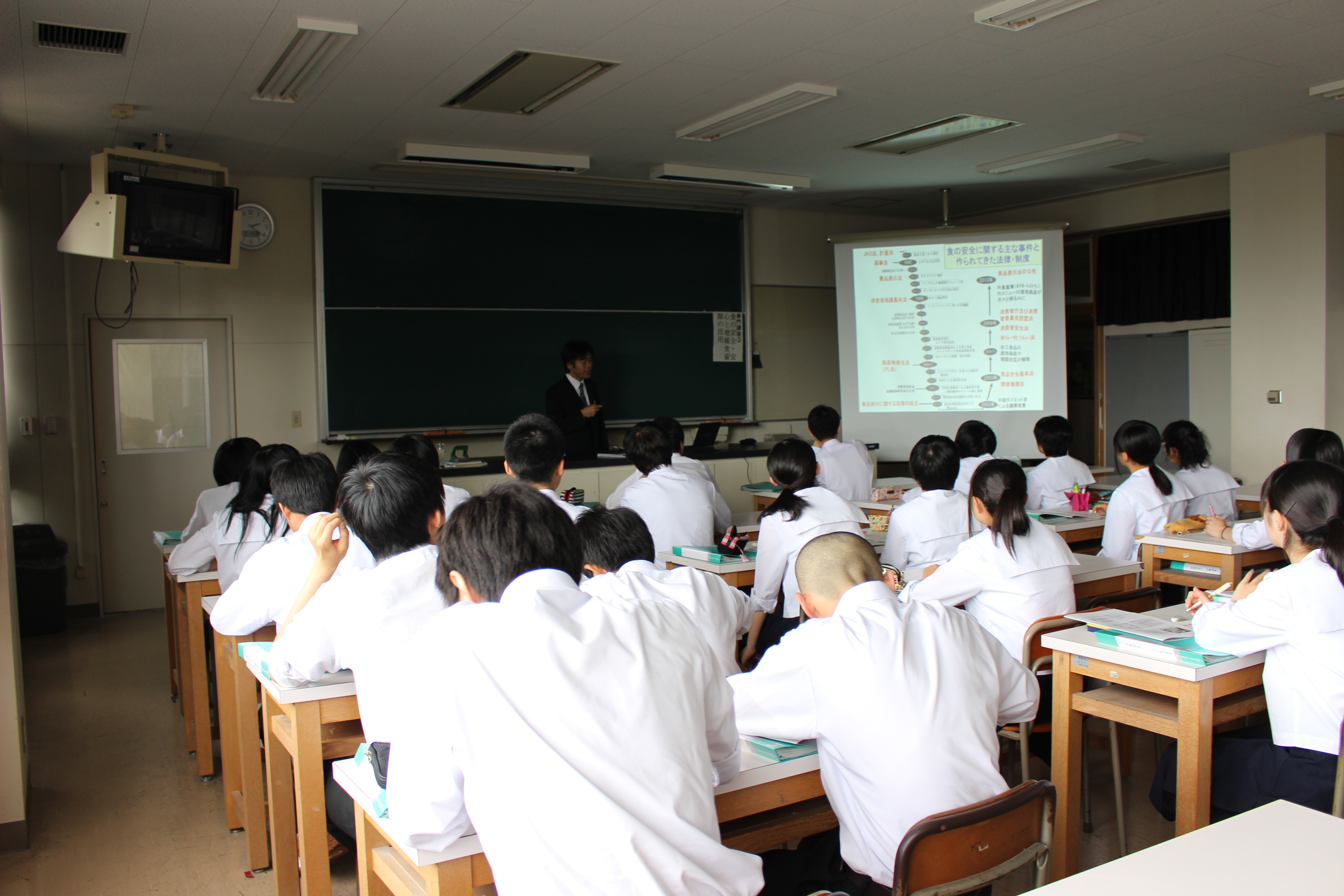 食の安全・安心を脅かす最近の事件をはじめ、食の安全安心を維持するための社会制度と生活者・消費者 の役割、日本の食糧自給率の低下、地域食資源の活用などといったことについてお話いただきました。生徒も 積極的に質問し、活発な意見交換をしていました。